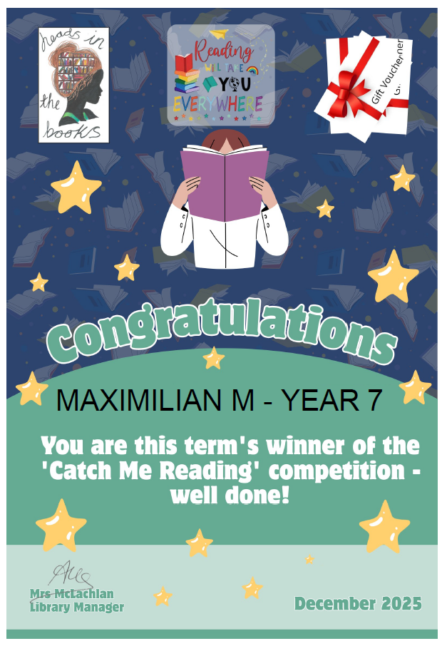 Congratulations to Mufaro in Year 8 who is the first winner of the Library's new competition which runs every half-term.
