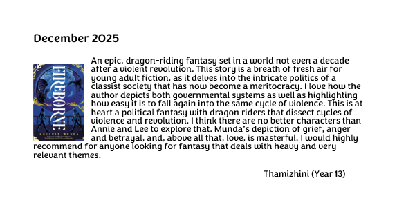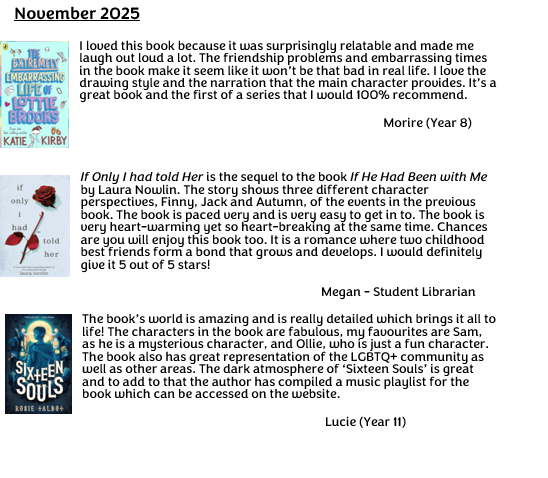 Students and staff are encouraged to provide the library with any good reads they have discovered lately. Most reviews and recommendations will have generally come from books that have been borrowed from the school library. Included, however, will also books that have been read from various sources.