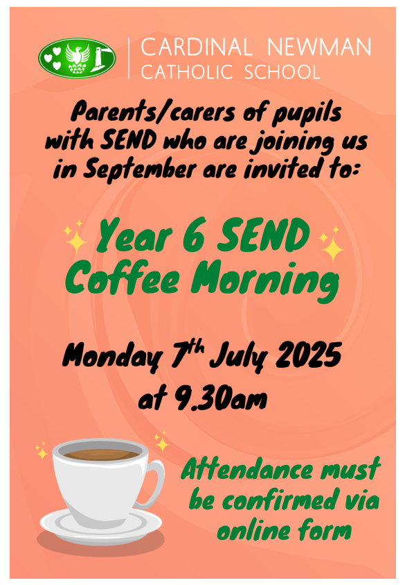 We invite parents/carers of pupils who are on the Special, Educational, Needs and Disabilities Register to our 'Year 6 SEND Coffee Morning' taking place on Monday 7th July 2025. Please confirm your attendance via the online form: https://forms.office.com/pages/responsepage.aspx?id=Dw9zL68-oUKuI1WW1v2yBAih3dCImi9FhAZ5qKVqVZlUM1M0NjJDQ1RVV0VJS1M1SFVCWTkxSk9UMy4u&route=shorturl